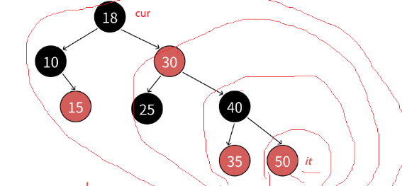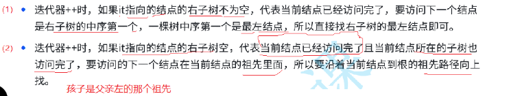 当it为空时结束循环 我们查找时,遵循查找右子树最最左边的值,如查找10的下一位就是15 当右子树为空是,我们就循环找找到孩子是父亲左边的祖先,如查找15的下一位时就必须向上查找直到找到18