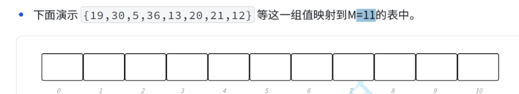 将上面的数据映射到M=11的表中,我们首先需要将数据取模