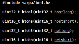 这些函数名很好记, h 表⽰ host , n 表⽰ network , l 表⽰ 32 位⻓整数, s 表⽰ 16 位短整数。