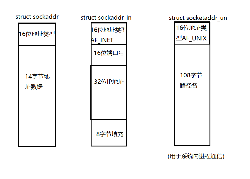 socket API是⼀层抽象的⽹络编程接⼝,适⽤于各种底层⽹络协议,如IPv4、IPv6,以及后⾯要讲的UNIX Domain Socket. 然⽽, 各种⽹络协议的地址格式并不相同.