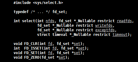 int select(int nfds,fd_set *readfds,fd_set *writefds,fd_set *exceptfds,struct timeval *timeout);